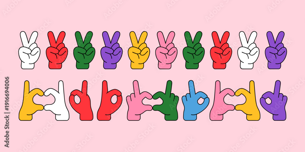 Vibrant Hand Gesture Concepts: Expressing Peace & Boldness in Cartoon Style – Colorful Hands Making Victory, Love Heart, and Okay Signs on Pink Background for Social Media, Graphic Design, and Creativ #1916694006