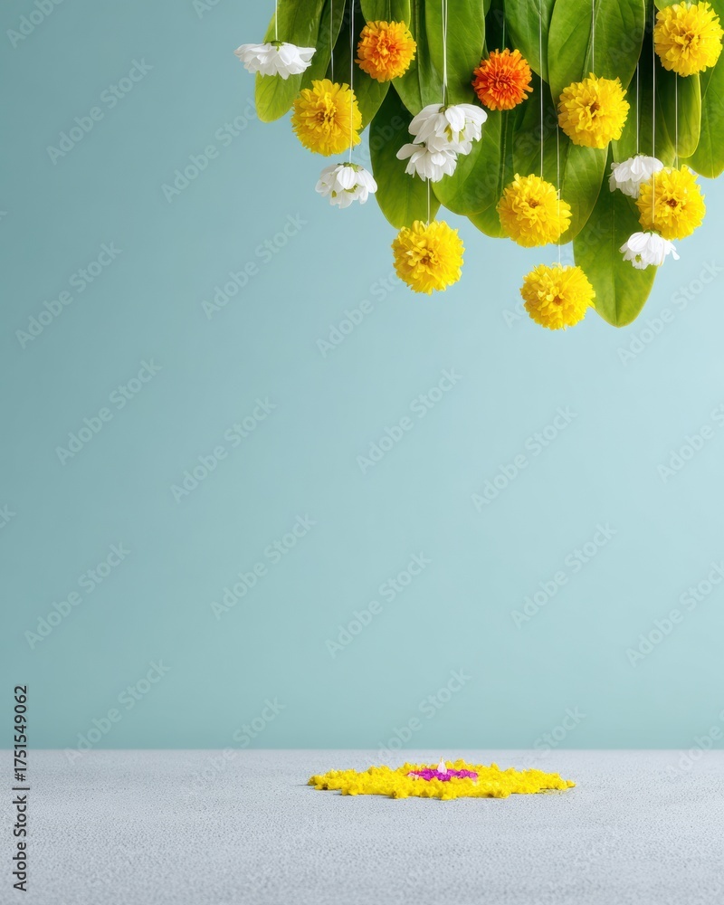 Vibrant Indian Diwali Festival Decor with Hanging Marigold and Jasmine Flowers Premium Traditional Floral Arrangement for Modern Holiday Marketing Campaigns #1751549062