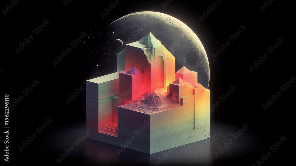 Vibrant Isometric Fantasy Cityscape with Moon and Stars #1962296110
