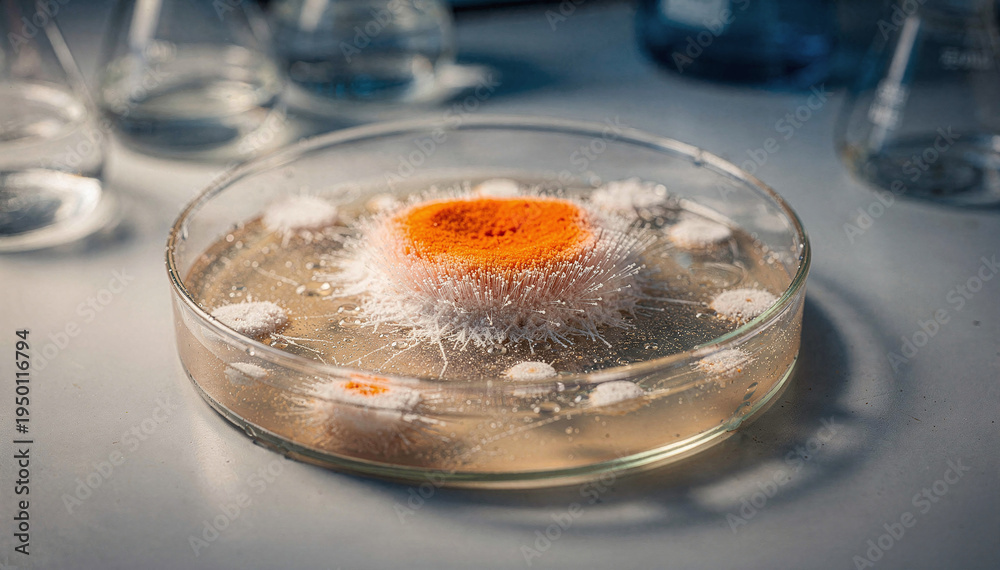 Vibrant Microbial Colony Growth in a Petri Dish, Showcasing a Striking Orange Center Surrounded by Fungi and Liquid Medium in a Science Laboratory Setting #1950116794