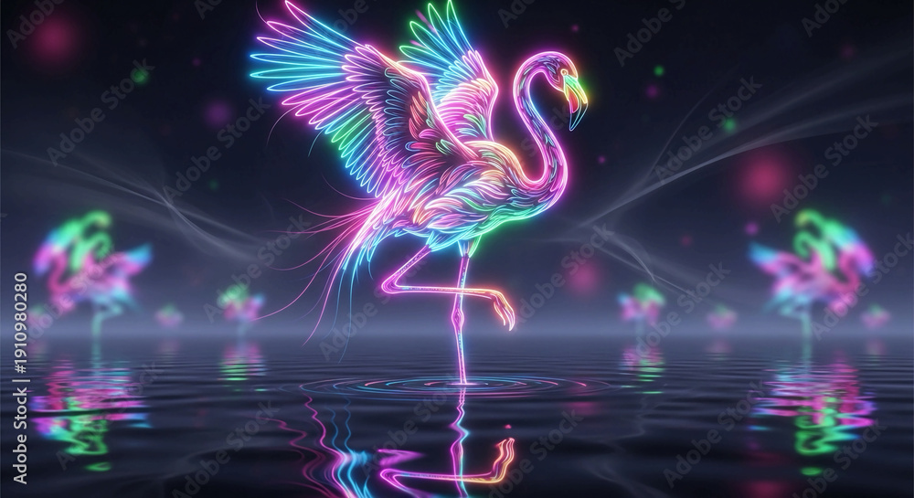Vibrant neon flamingo stands on one leg in futuristic water scene with colorful reflections and dark background #1910980280