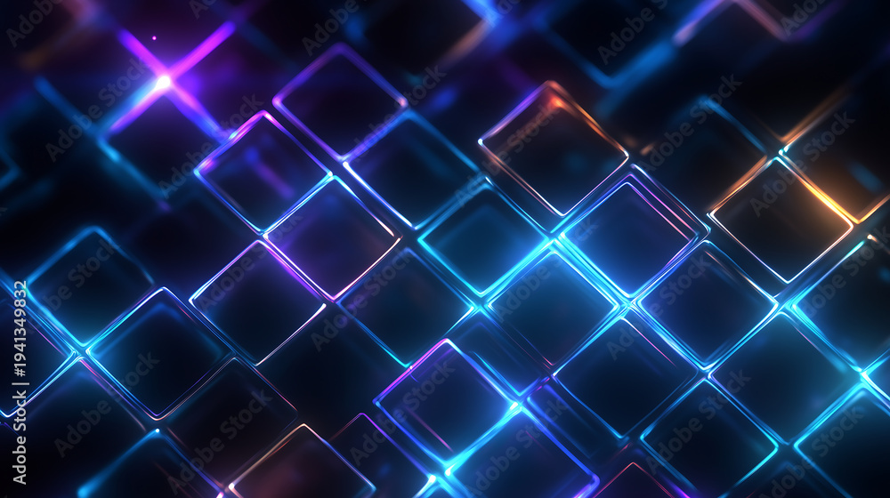 Vibrant neon lights illuminating a grid of squares in a futuristic pattern. #1941349832