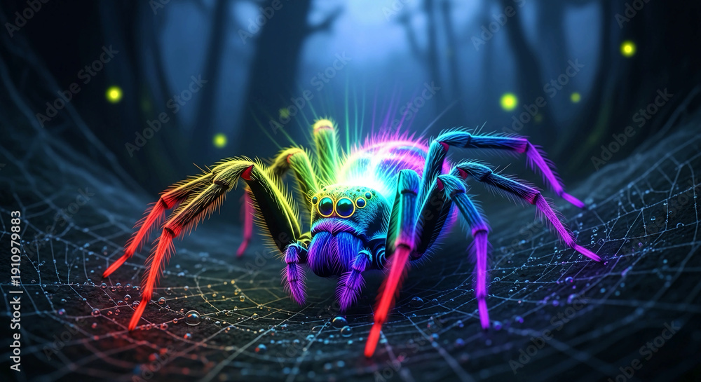 Vibrant neon spider on web in dark mystical forest with glowing lights #1910979883