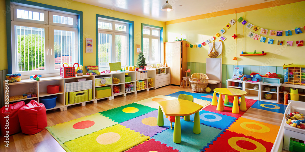 Vibrant nursery room in a kindergarten or daycare center filled with colorful toys, learning materials, and educational resources for young children's recreational learning activities. #883375594
