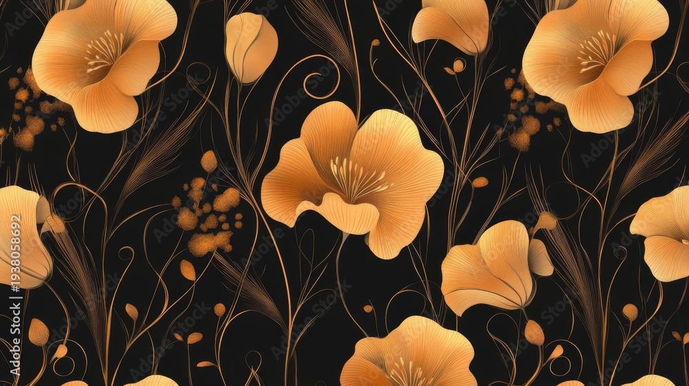 Vibrant orange floral pattern seamless design elegant flowers on dark background for print and digital use. #1938058692