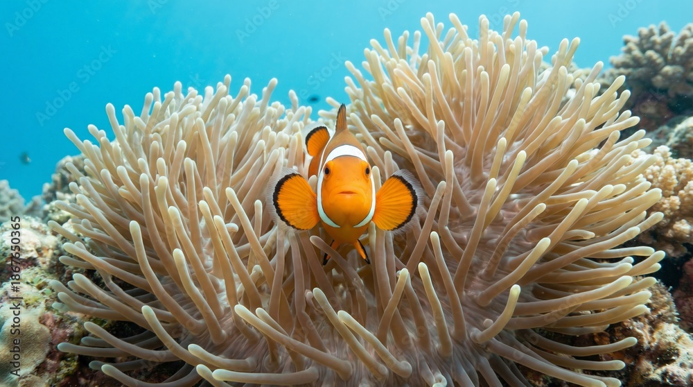 Vibrant Orange Ocellaris Clownfish Swimming in Sea Anemone on a Tropical Coral Reef #1867650365