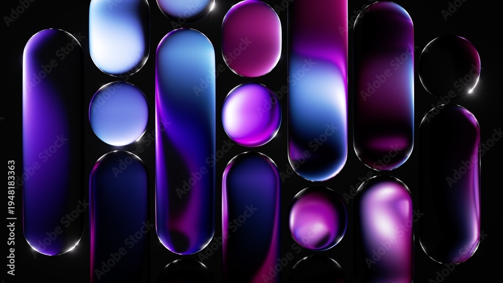 Vibrant pink and blue gradient bubbles, reflective surfaces with a seamless flowing structure. 3d render illustration. #1948183363