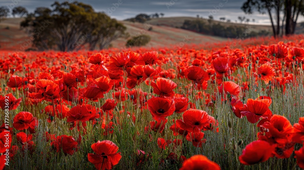 Vibrant poppy field honoring Remembrance Day and Anzac Day in a serene rural landscape, filled with red flowers under a cloudy sky #1773683692