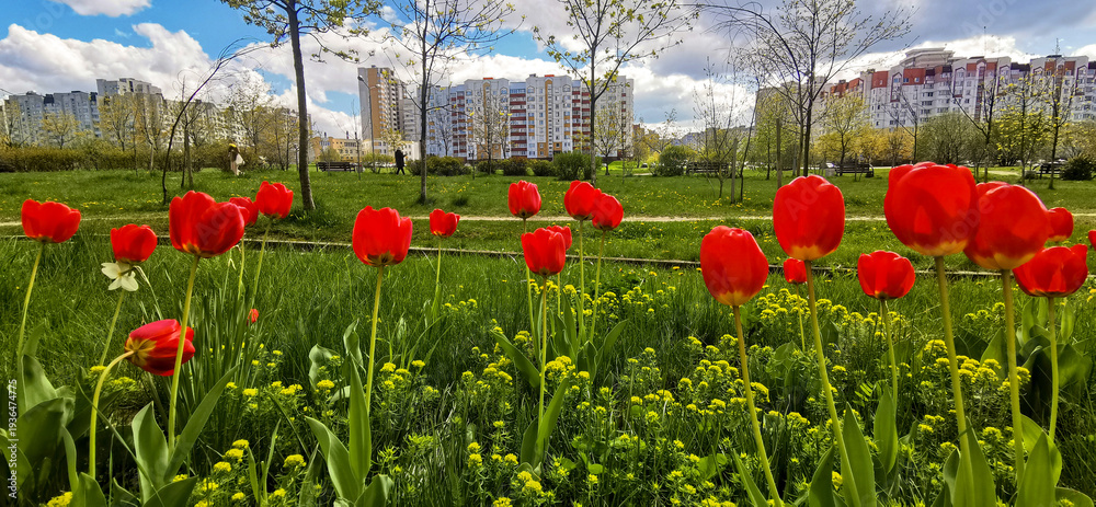 Vibrant red tulips and wildflowers in a spring urban park foreground. Green spring nature contrasts sharply with modern residential buildings, symbolizing city life and green space. #1936474775