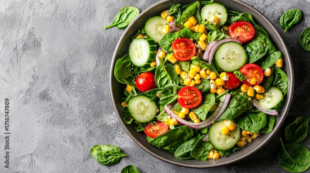 Vibrant Spinach Salad with Corn, Cucumber and Tomatoes Overhead Composition, healthy food, summer salad, recipe healthy recipe, summer salad #1716747809