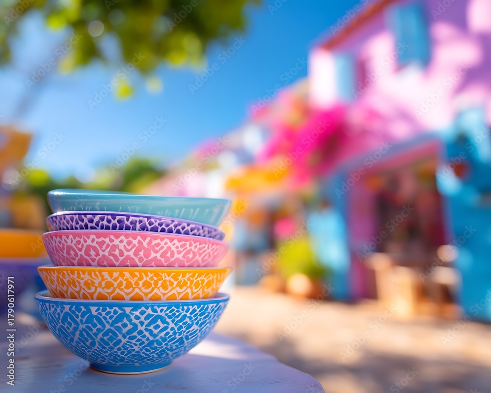 Vibrant stacked ceramic bowls invite summer dining in a colorful Mediterranean village setting #1790617971