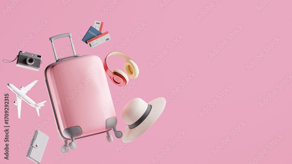 Vibrant summer travel accessories floating on pink background. Minimal summer vacation concept. 3d rendering #1709292315
