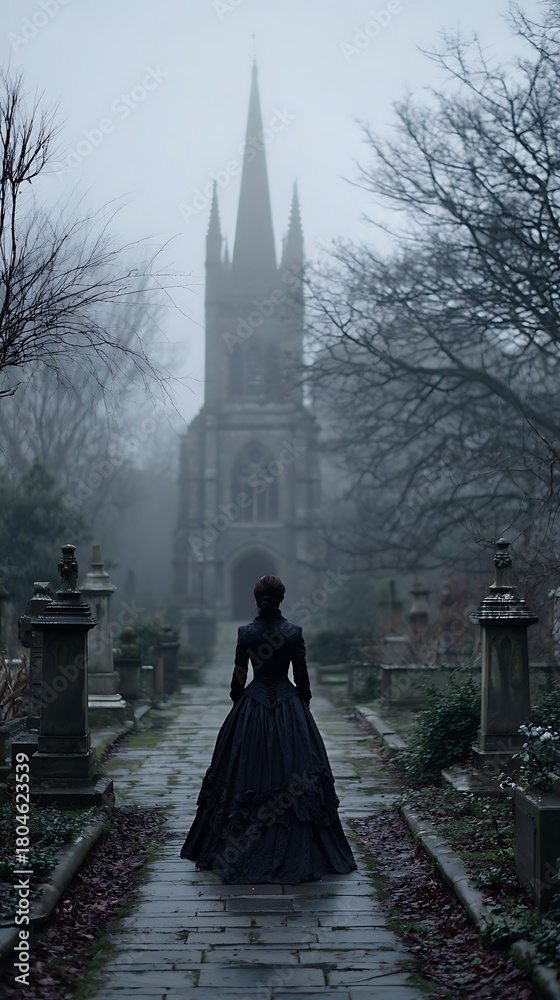 Victorian woman in black dress walks towards gothic church, fog #1804623539