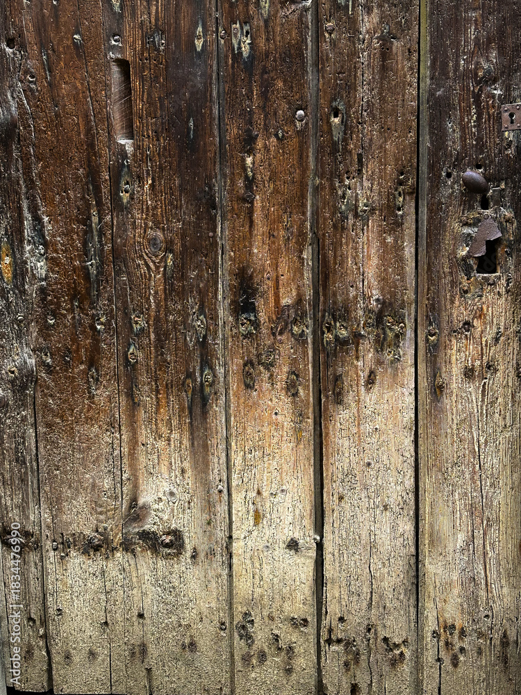 vieille porte en bois usée recouverte de clous pouvant servir d'arrière plan ou de texture #1834476990