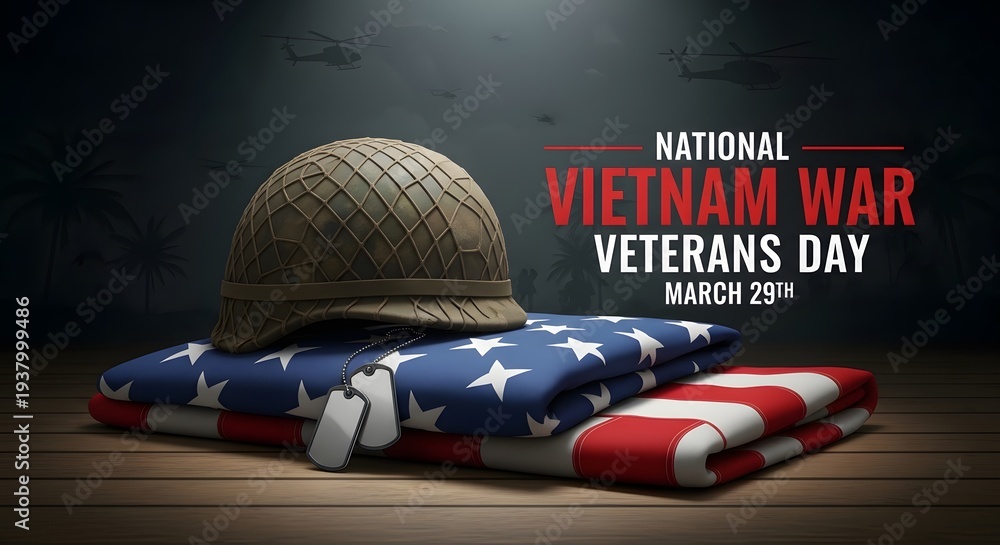 Vietnam war veterans day banner with military helmet and american flag #1937999486