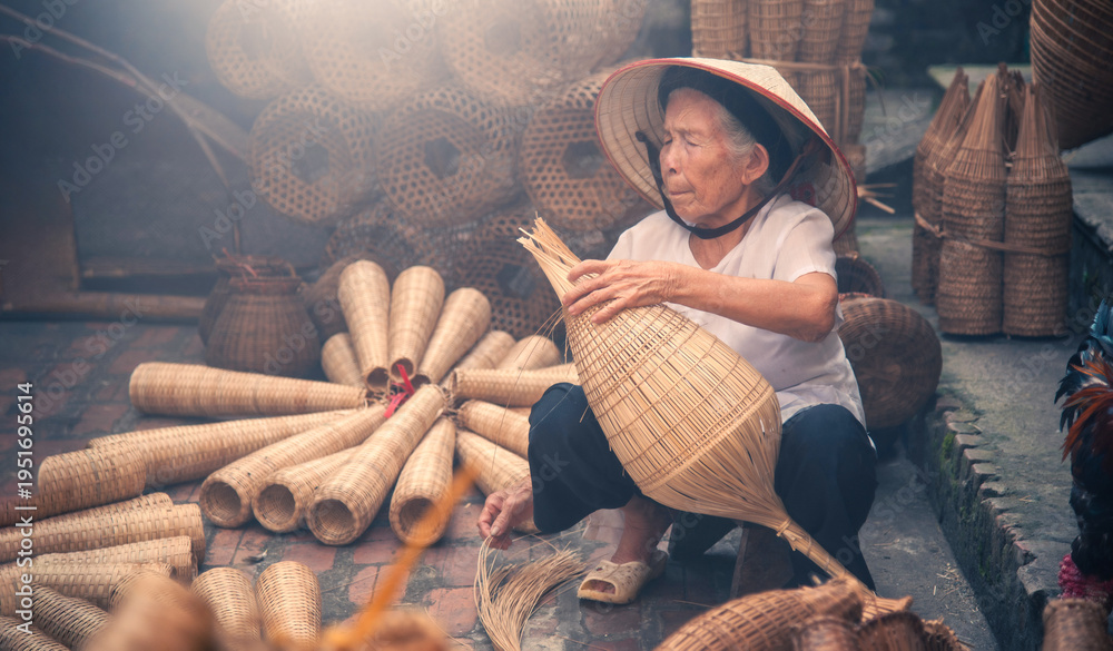 Vietnamese fishermen are doing basketry for fishing equipment at morning in Thu Sy Village, Vietnam. #1951695614