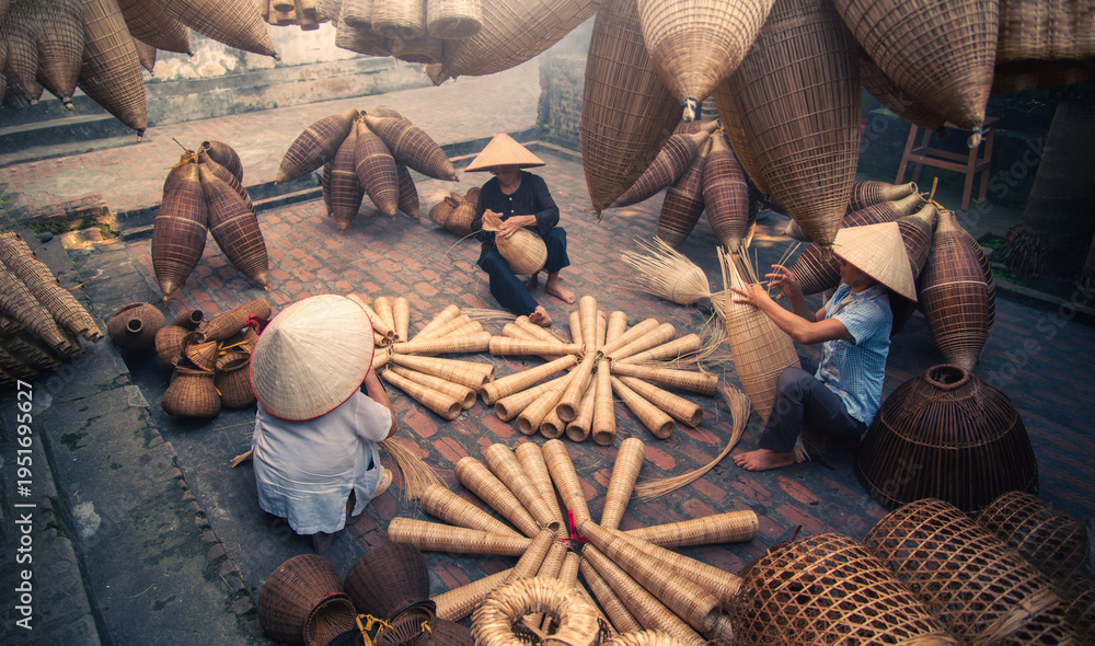 Vietnamese fishermen are doing basketry for fishing equipment at morning in Thu Sy Village, Vietnam. #1951695627