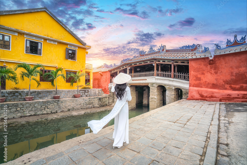 Vietnamese woman wearing Vietnamese national costume walks around Hoi An Ancient Town, Hoi An, Vietnam. #1254630215