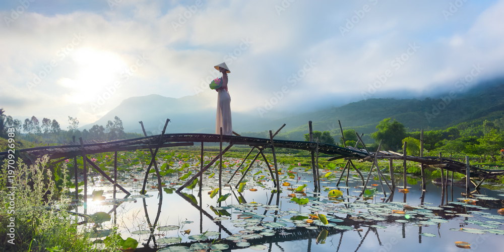 Vietnamese Woman White Dress Lotus Pond Bridge Tra Ly Sunrise #1970926983