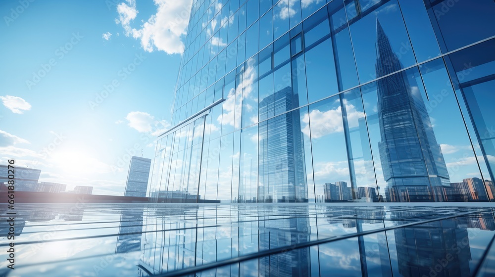 View of a contemporary glass skyscraper reflecting the blue sky #661880276