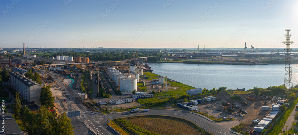 View of an industrial zone near a river in Riga, Latvia, featuring storage tanks, cranes, a shipyard, a curved road, and a tall transmission tower. #1646265206