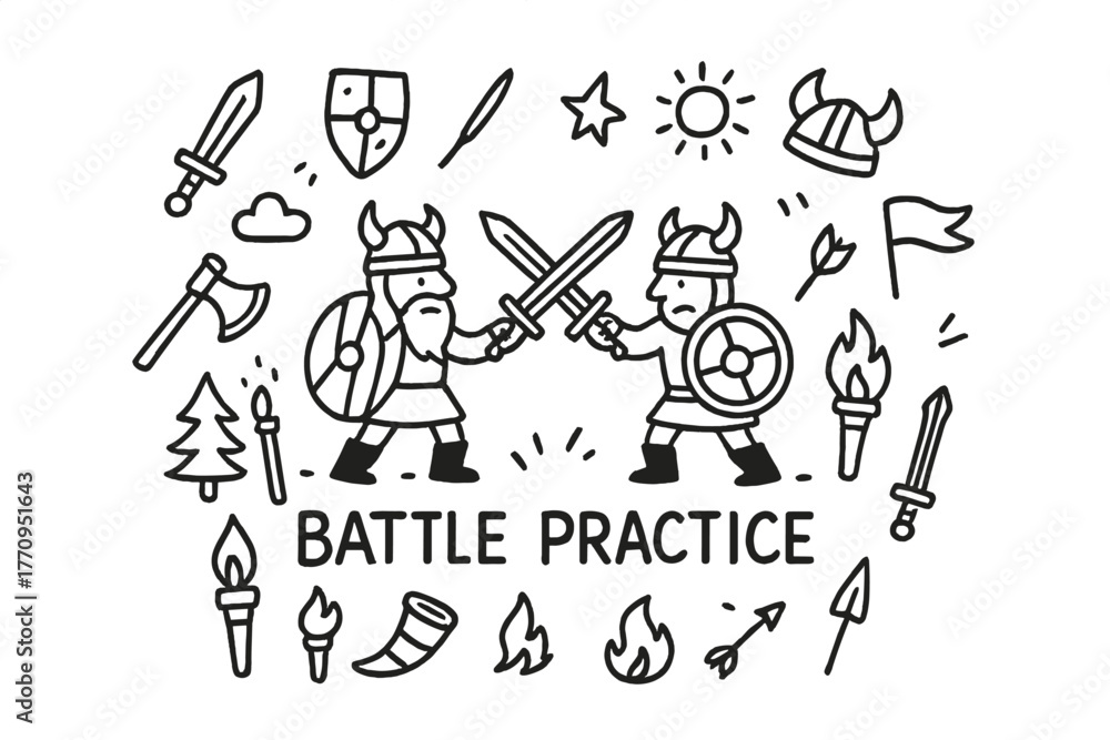 Viking Battle Doodles. Battle practice. Hand-drawn doodle illustration of battle practice. In the middle, one #1770951643