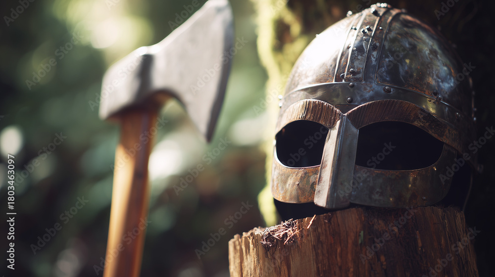 viking. Weathered Viking helmet beside wooden stump with embedded axe. event programs, museum guides, designed for cultural heritage projects and event programs, used by lab technicians. #1803463097