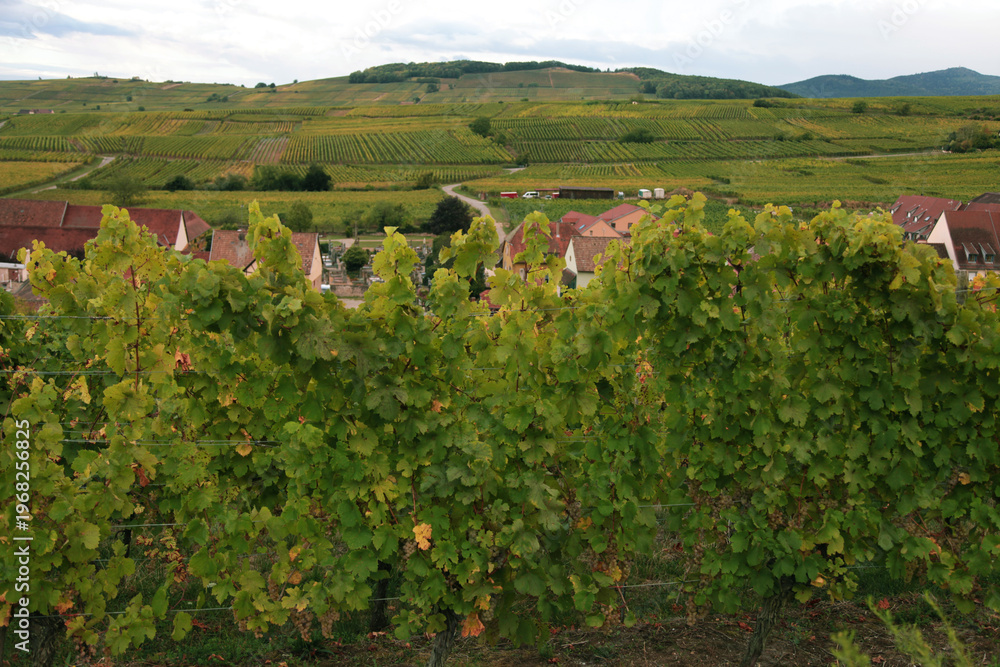 Vineyard landscape in France showcasing rows of grapevines under a clear blue sky with a distant farmhouse and lush green hills in the background #1968256825