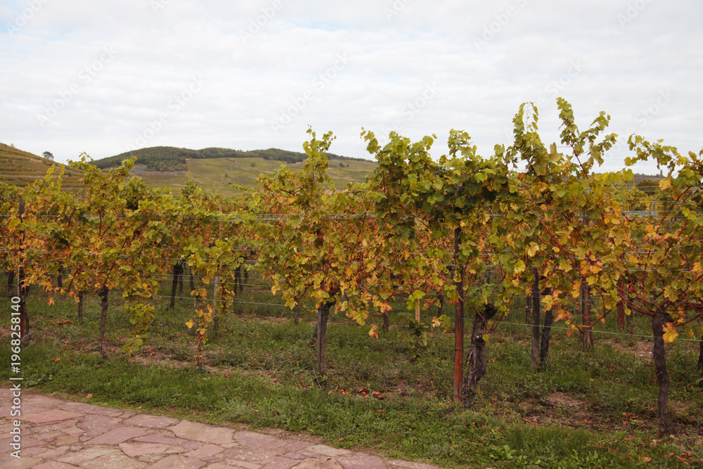 Vineyard landscape in France showcasing rows of grapevines under a clear blue sky with a distant farmhouse and lush green hills in the background #1968258140
