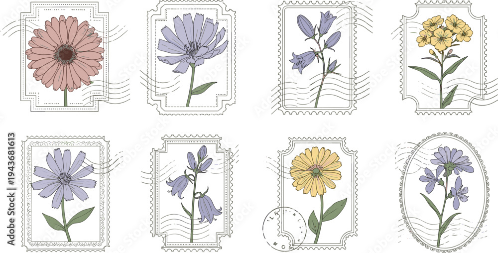 Vintage botanical postage stamp collection featuring pastel wildflowers, hand drawn floral illustrations with retro mail marks decorative vector set #1943681613