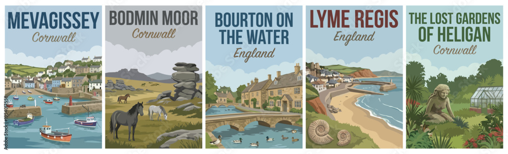 Vintage british united kingdom travel poster set. Including mevagissey, bodmin moor, bourton on the water, lyme regis, and gardens of heligan. Retro vector. #1954017558