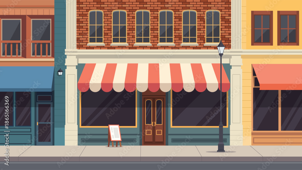 Vintage City Storefront and Shop Facade.Charming Retro Boutique with Striped Awning on a City Street.Flat Design Urban Streetscape with Classic Small Business Shops #1865166369