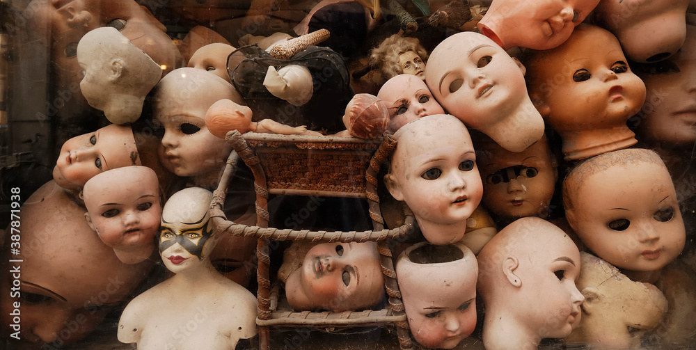 Vintage dolls heads. Horror, creepy, macabre dolls and dolls heads of various shapes, decapitated or broken. Halloween nightmare, pure terror scenario #387871938