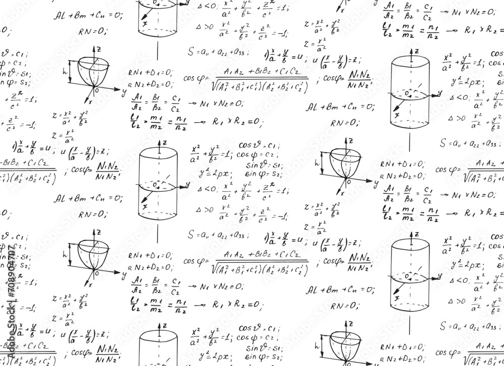 Vintage education background. Trigonometry law theory and mathematical formula equation on whiteboard. Vector hand-drawn seamless pattern. #708904707