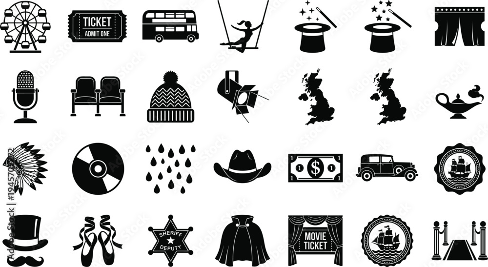 Vintage entertainment and theater icon set with circus magic ticket stage performance symbols retro silhouette vector illustration collection #1945702272