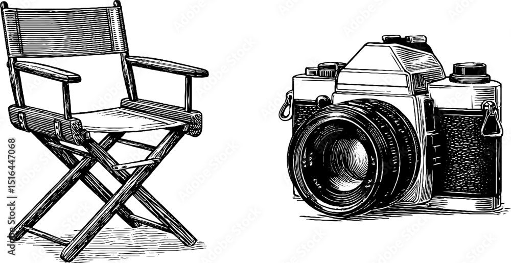 Vintage film camera and director chair engraving for cinematic art and design projects #1516447068