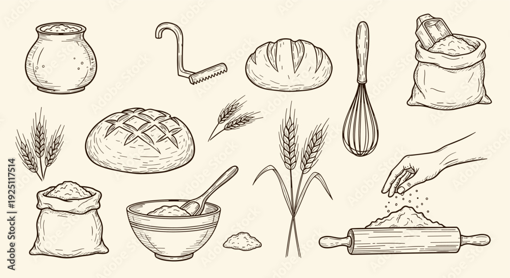 Vintage illustration of baking ingredients and tools including wheat ears bread dough flour sacks and whisk for bakery or food preparation #1925117514
