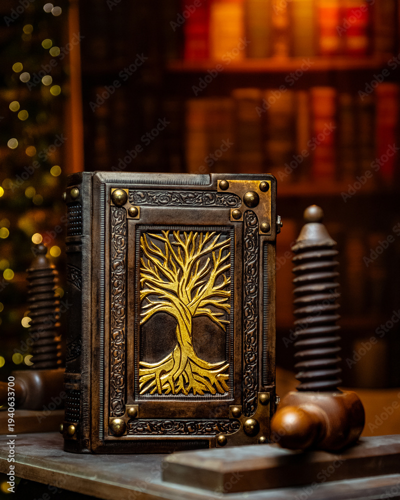 vintage leather book with the gilded tree in the bookbinding press in front of the bookshelf #1940633700