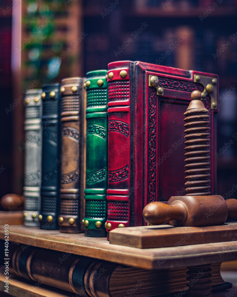 vintage leather books in different colors in the bookbinding press in front of the bookshelf #1940628913