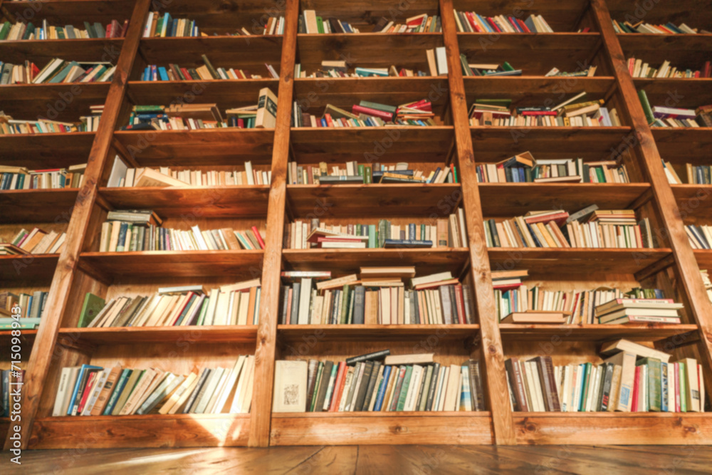 Vintage Library With Bottom View Of Library Shell Featuring Old Shabby Books. Blurred Image Adds Timeless And Classical Touch To Scene, Emphasizing Aged And Worn Characteristics Of Antique Books #715098943