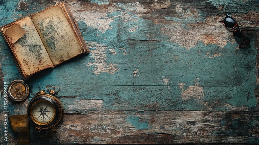 Vintage nautical explorer's desk with compass, map, and sunglasses on weathered wood #1326369918