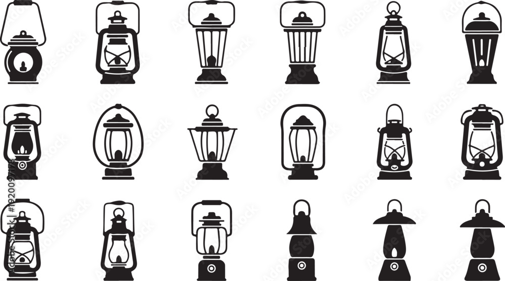 Vintage Oil Lantern Icons and Kerosene Lamp SilhouettesOld Fashioned Lantern Collection Silhouette VectorAntique Oil Lamp Set for Camping and Lighting #1920097178