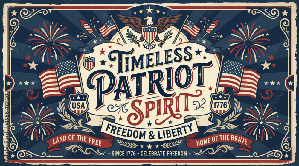 Vintage patriotic design celebrating timeless spirit of patriotism with flags and fireworks #1958702120