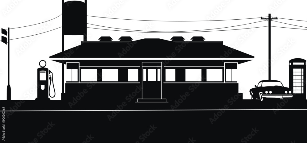 Vintage roadside diner and gas station silhouette featuring retro car, fuel pump and telephone booth isolated for urban landscape design projects #1906260365