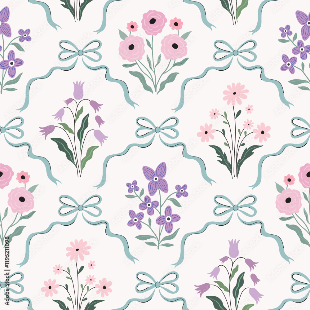 Vintage seamless pattern with spring floral bouquets and coquette ribbons, elegant wallpaper, trendy background #1195211098