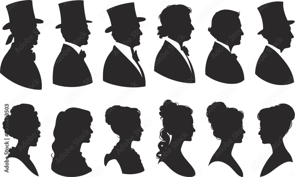 Vintage Silhouette Portraits of Men and Women in Historical Attire vector illustration #1924863503