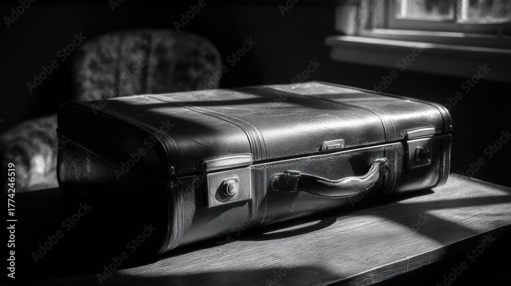 Vintage suitcase on table in dim light retro style travel concept #1774246519