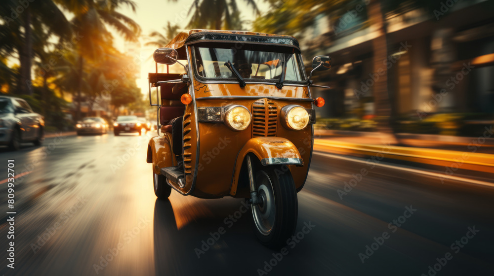 Vintage Tricycle Taxi Speeding Through Tropical City Street at Sunset #809932701