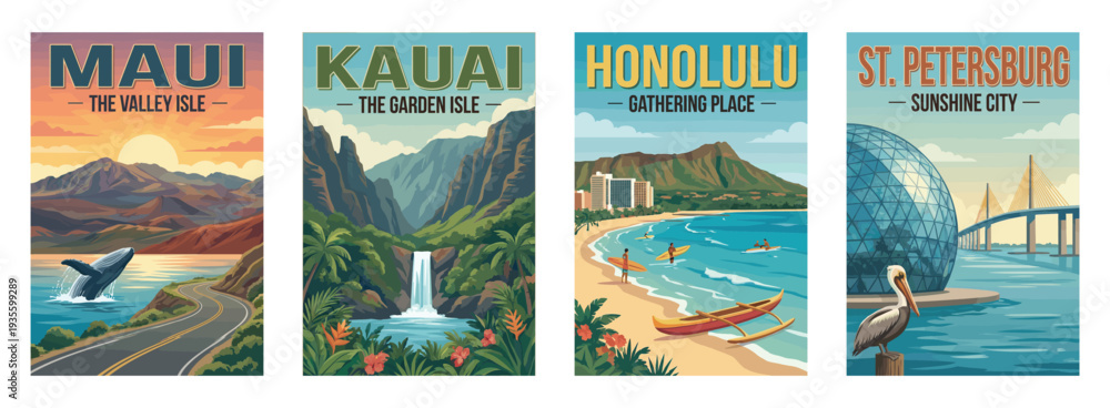 Vintage USA travel poster set. Featuring maui, honolulu, kauai, and st petersburg coastal scenes. Retro tropical landscape vector illustration. #1935599289