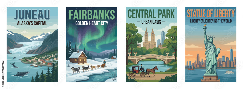 • #1935599332 Vintage USA travel poster set. Including juneau, fairbanks, central park, and statue of liberty landmarks. Retro travel vector illustration.